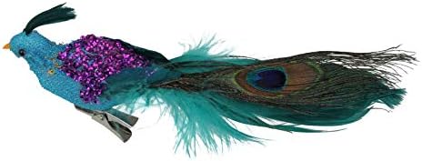 Product Features : Fully dimensional ornament ; Designed with a blue glittered body.Features green feathers embellished with purple sequins ; Accented with one green, brown and blue feather.Comes ready-to-attach with a gold crocodile clip.Dimensions: 2″H x 1.5″W x 8″L ; Material(s): foam/feather/plastic/glitter/metal.Recommended for indoor use only.