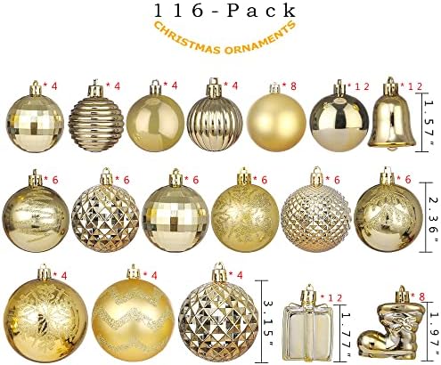 116ct Christmas Ornaments Set, Assorted Shatterproof Christmas Tree Ornaments, Christmas Balls & Baubles Value Gift Package (Gold)
