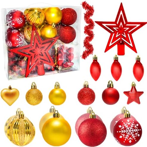 🎄【50pcs Christmas Balls Ornaments】50 counts in 9 styles respectively of the shiny, matte, glitter drenched and hollowed designs.Package Includes: balls (2.3 inch, 1.3inch ,1.2 inch), tree top star (7.8 X 7.8 inch), tinsel garland(13ft), totaling 50 beautiful pieces, allowing you to fill your tree from top to bottom.