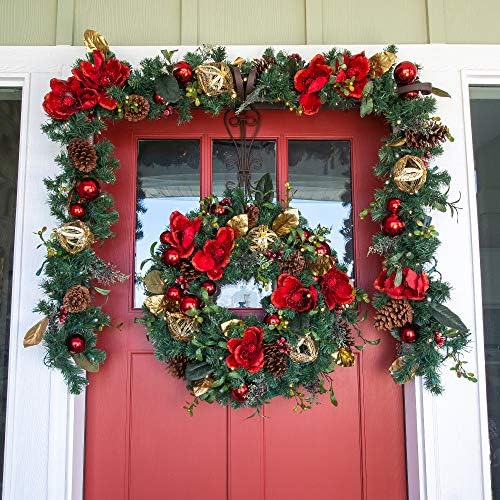 [9 Foot Artificial Christmas Garland] – Red Magnolia Collection – Red and Gold Decoration – Pre Lit with 100 Warm Clear Colored LED Mini Lights – Includes Remote Controlled Battery Pack with Timer