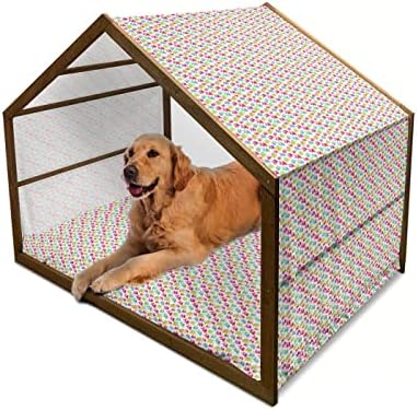 Ambesonne Animal Cartoon Wooden Dog House, s with Ornaments Joyous Friendly Pattern, Indoor & Outdoor Portable Dog Kennel with Pillow & Cover, 2X-Large, Green Blue PinkMeasurements – 39.5″ X 55″ X 45″ Wooden Frame and 42.5″ X57″ Cushion Cover. House for your lovely friends.Made from – Utmost comfort and premium