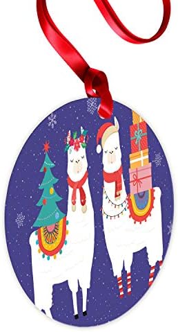 Ambesonne Christmas Flat Ornament, Cartoon Llamas in Noel Concept with Gifts Ornaments and Tree, Circle Aluminum Semi Gloss Hanging Decor Tree Decoration, 3.9″ Round, Dark Lavender Multicolor
