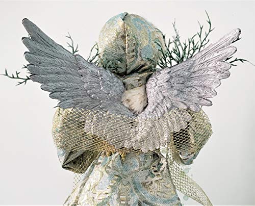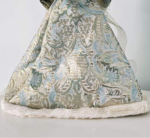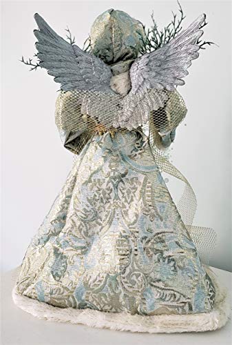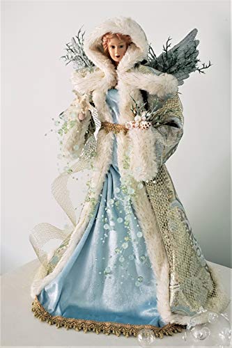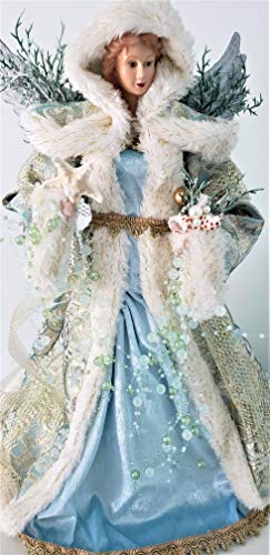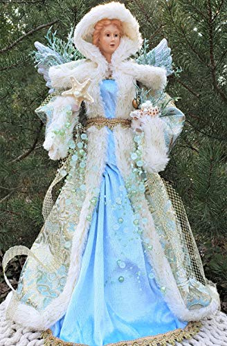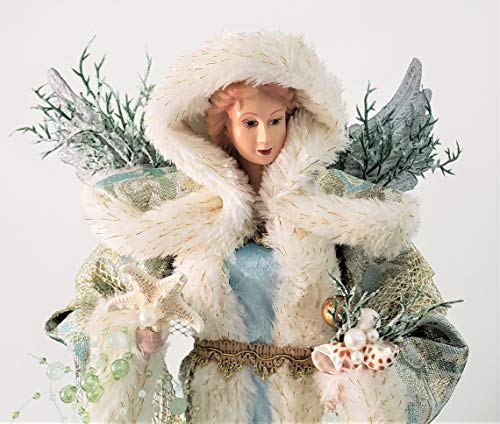 Our absolutely gorgeous beach blue Christmas decor angel can be used as a tree topper for your coastal holiday tree or as a freestanding décor piece. This beautiful coastal Christmas decor angel is a very special artisan handmade piece. She can be used as a décor item in your home, or there is a clear plastic cone beneath her skirt for easily sitting her atop your large holiday tree. Fabulous soft aqua blue for a true blue Christmas!! She stands 17” tall and is clothed in rich and elegant brocades and velvets in soft coastal blue and whites. She has a detailed and very pretty face, and holds in her hands a bit of our “aqua” beaded garland, real thorny starfish, and colorful pretty shells. Her large silver wings are complemented with pretty winter greens and are attached firmly to her back. Her outfit is gorgeous rich brocade accented with elegant velvet, fancy gold trim, and gold netting ribbon. Free Shipping. 17″ tall. Christmas items are “first come first served”, no additional quantities will be available. Due to the short season, Christmas items are not returnable.