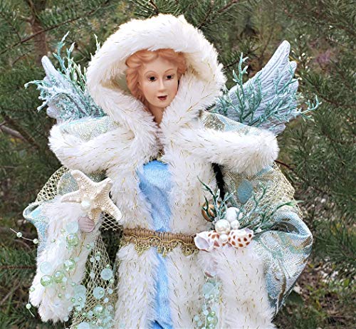 Beach Blue Christmas Decor Angel Tree Topper, Coastal Nautical Large Angel Tree Topper w Starfish, Shells