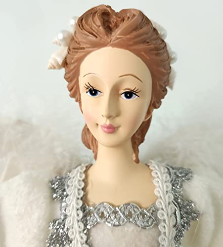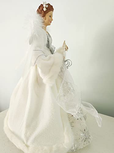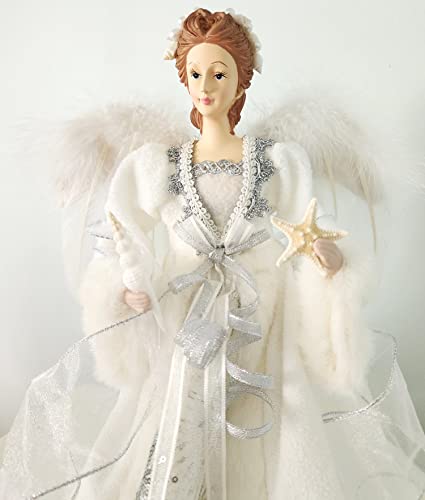 Beach coastal angel Christmas tree topper. Our ethereal white angel tree topper will look perfect on your tree or mantle this Christmas, beautifully white to match any beach décor! She wears an opulent outfit featuring lots of fur trim, soft fleece, a taffeta skirt with silver sparkles, a bodice of silver trim and elegant fabric, silver and white wired stole ribbon, and satin/silver cascading ribbons. Her lovely head is adorned with a crown of REAL tiny shells and pearls, and her angel wings are REAL white feathers. Her skin is beautiful and her face is flawless. She holds a REAL white spindle shell and white knobby starfish. She’s absolutely perfect for topping your large coastal Christmas tree, or you can use her free-standing on a tabletop, the mantle or hearth, or on a sofa table or dining buffet arrangement. She makes an elegant and unique gift too! She measures approximately 14” wide at the base of her skirt by about 16.5” tall. She has a plastic cone inside to work as an elegant topper.She measures 16″ high by about 13″ wide. Due to the short season, Christmas Collection items are non-returnable.