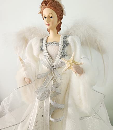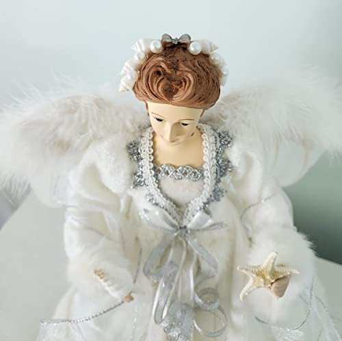 Beach Coastal Decor Angel Tree Topper, White Angel Figurine or Tree Topper w Coastal Shells & Starfish