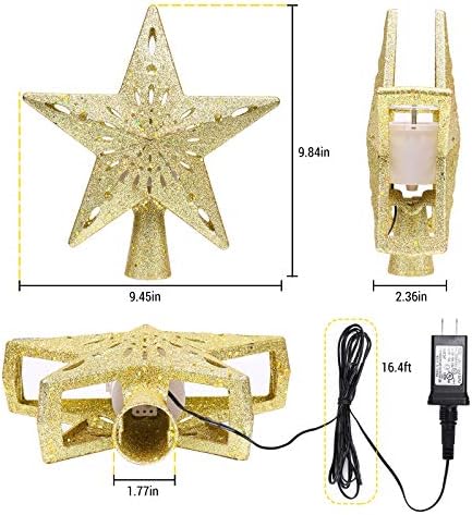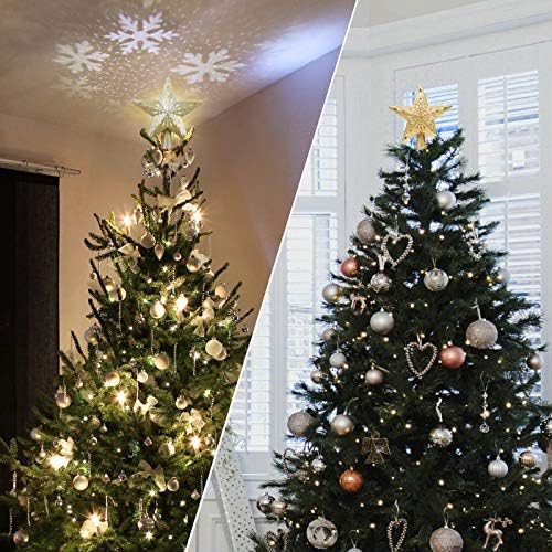 Features: 2 in 1 Christmas projection tree topper, not only a Christmas topper, but also a projector lights. Star shape hollow design with sparkling gold powder, create magic and shining star for the top of your Christmas tree. Fantastic and dynamic snowflake lighting effect, provide magical lighting effects for your