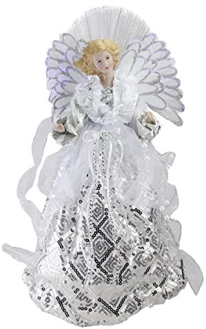 18″ Lighted White and Silver Angel in a Dress Christmas Tree Topper – Warm White Lights