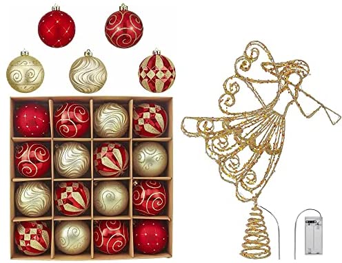 Valery Madelyn Luxury Red &Gold ChristmasOrnaments Bundle(2 Items ) 16ct 80mm Shatterproof Christmas Tree Ornaments and 1 Pcs Angel Christmastree Topper for Xmas Decoration