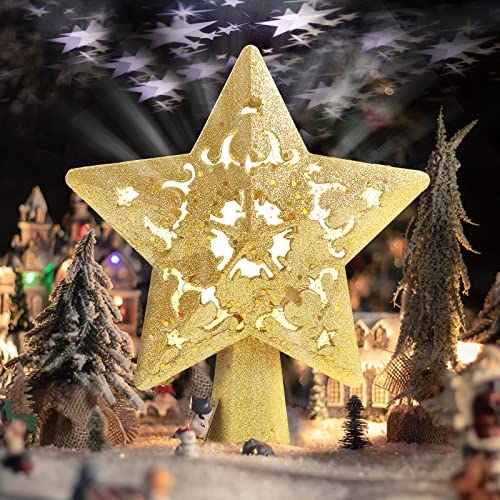 Lighted Christmas Tree Topper, Glittery Gold Star Tree Topper 6 Kinds of Projection Effects with Rotating Magic Snowflake LED Projector for Xmas Holiday Party Gift Décor