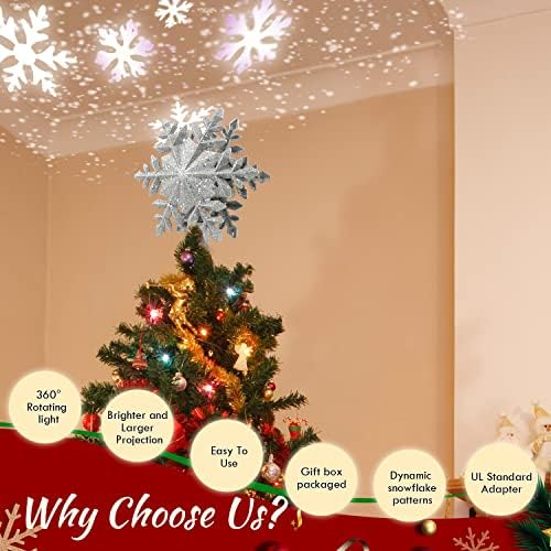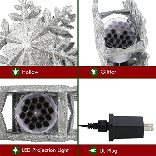 Unique Christmas Tree Topper: The Christmas tree toppers designed in snowflake shape with 360° rotating LED projector lamp inside. The frame of the snowflake tree topper is added with glitter powder material, which add sparkling light to your Christmas tree top. The Christmas tree topper built-in rotating snowflake LED projection lamp is a beautiful snowflake effect that can be adjusted to project different angles