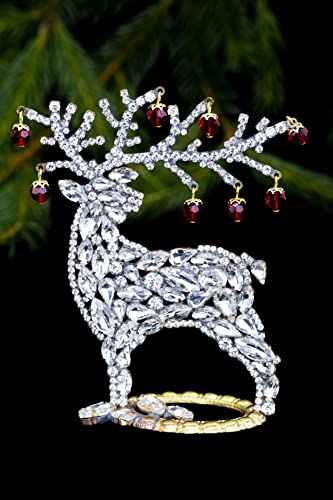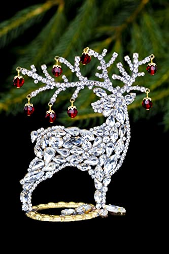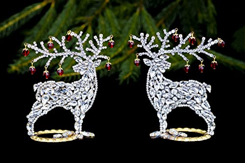 Delicate Christmas Reindeers made with clear coloured rhinestone crystals. Antlers are finished off beautifully with Emerald and LT Siam coloured heart shape rhinestone crystals. They come in a set of 2. Size: 3,6×4,7×1,4 inch – one reeindeer (9,3x12x4 cm). Unique Christmas Reindeers. Hand made bijoux. Czech rhinestones. Set in non-plated brass. We follow the spectacular craft bijoux history of our region. We use old handmade techniques and use only the finest material and best quality crystal’s. If there is an item that you are interested in but would like some changes made or something unique added, please do not hesitate to contact us. We are able to meet the demanding requirements of designs (figures up 1m high). We are able to guarantee FREE delivery to USA within max. 10 working days via FEDEX. Free worldwide economical transport for the rest of world may take up 2 to 30 days.