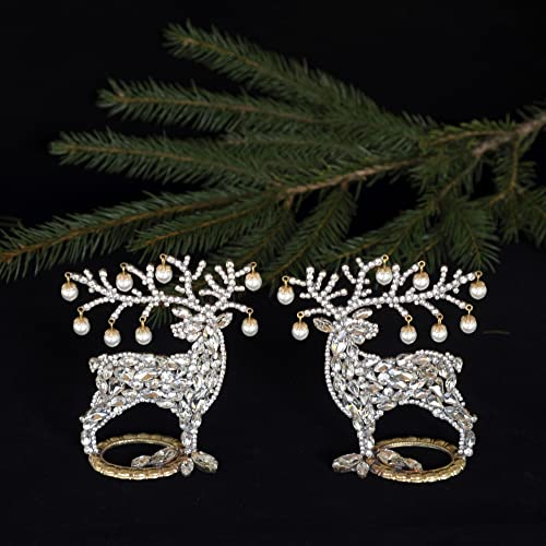 Delicate Christmas Reindeers made with clear coloured rhinestone crystals. Antlers are finished off beautifully with pearl coloured rhinestone crystals. They come in a set of 2. Size: 3,6×4,7×1,4 inch – one reeindeer (9,3x12x4 cm). Unique Christmas Reindeers. Hand made bijoux. Czech rhinestones. Set in non-plated brass. We follow the spectacular