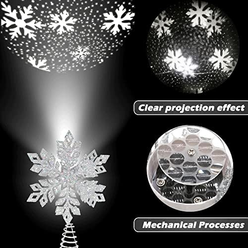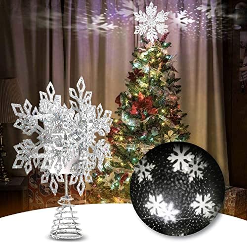 Christmas Tree Top Light – Metal Glittering Silver Snow Tree Topper with 3D Rotating White Snowflake LED Projector – Christmas Tree Topper Decorations for Xmas/Holiday/Home Wonderland Party Ornament