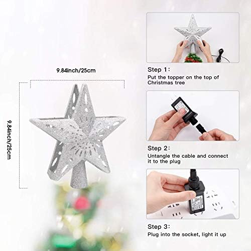 Product Description Gold Silver Gold 3 Pack 4 Pack 【Christmas Tree Topper Star】Universal size for all kinds of different Christmas trees(9.8in(H) x 9.4in(L) x 1.8in(D)) , The 9.2ft plug wire is long enough to make the tree topper star easy to be connected. A nice glittery addition to your Christmas