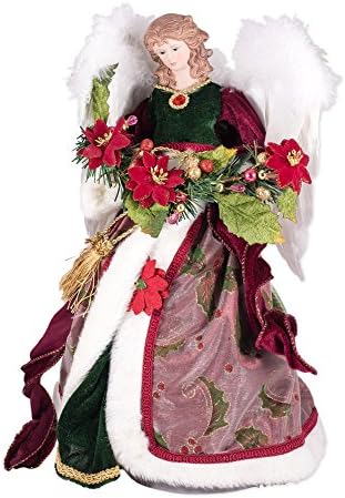 Roman Inc. Exclusive 16 inch tall beautiful Angel tree topper with white wings, a dark green gown and a sheer overlay coat with holy leaves. She hold a garland of poinsettias and can free stand or grace the top of a Christmas tree. 60% Cotton/ 40% RayonImportedRoman ExclusiveAngel CollectorsChristmas Home