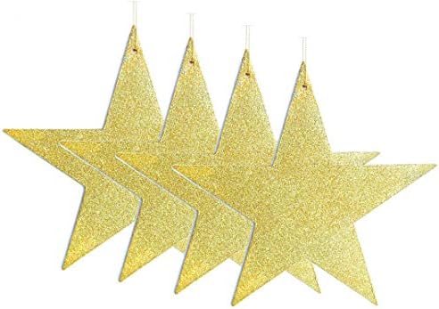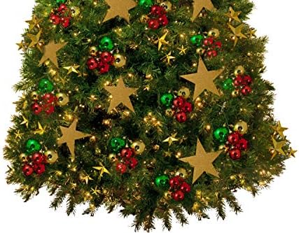 Decorations Included: 7 Sets of LED Energy Efficient Christmas Lights, 25 Red, Green, and Gold Ball Cluster Ornaments, 25 – 10in Gold Stars, 8in Red and 8in Gold Starburst Ornaments, 25 – Gold Star Picks & 1 Roll of each ribbon in Red and Gold.