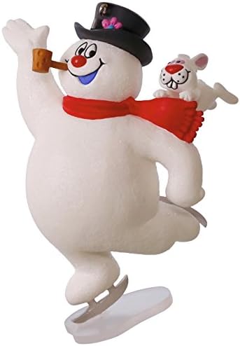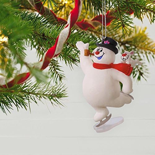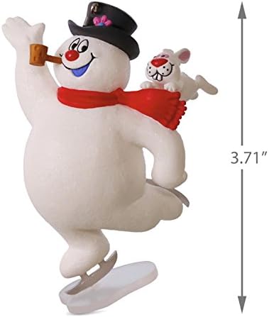 This Christmas tree ornament features a smiling, waving FROSTY THE SNOWMAN as he ice skates in his signature red scarf with rabbit Hocus Pocus on his shoulder.Festive and collectible, Hallmark Keepsake Ornaments come ready to give in a seasonal holiday gift box. The box can also be used for ornament