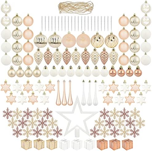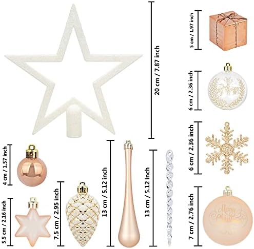 Product Description ITART Christmas Tree Decoration Ornaments Set Color: Rose Gold Champagne and White ITART 145ct Christmas Tree Decorative Rose Gold Champagne and White Pack including: Star Tree Topper ×1 Beads Garland × 3 Clear Icicles × 22 2.76 inches Balls × 6 2.36 inches Balls × 26 1.18 inches