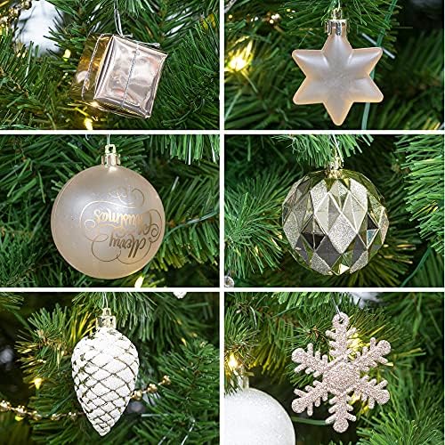 Set of 145 Rose Gold Champagne White Themed Christmas Tree Decorations Set. Ornaments hooks and hanging string included for easy hanging. Set of 143 Christmas Tree Balls Assortment Kit. All Christmas decorative ornaments are equipped with ornament caps. Material: Plastic, Glitter, and Foil.