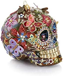 Our Skull With Butterflies Glass Ornament was first sculpted in clay and then mouth-blown in glass by old-world glass artisans in Poland. Inspired by the great heritage of Mexican sugar skulls, this ornament is highlighted with jeweled fluttering butterflies in tones of fuchsia, padparadscha and topaz. Our Skull With Butterflies