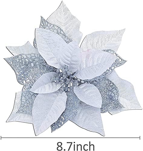 Colour Name:Gold 【8.7 Inch Giant Size Layered Poinsettia】 Pack of 12 Christmas Gold Glitter Poinsettia Flower Ornaments in 2 style petals,silk and glitter.Each poinsettia flower is appr.8.7 in diameter.Adding a little bling and shine to your Christmas tree.【Glitter Poinsettia Flowers】 Each Christmas flowers covered with many glitter powder.Glitter bunches of