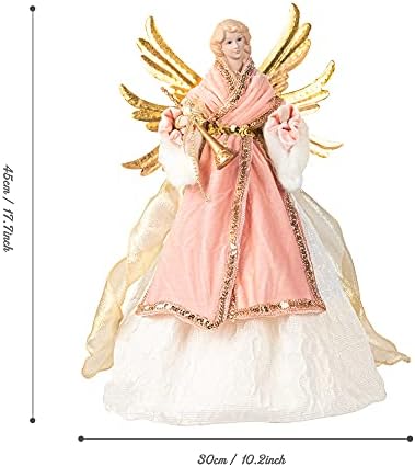 Classic Christmas tree topper. An angel tree topper is an all-time favorite Christmas decoration to give your tree an elegant and classic look.The beautiful Angel wears ivory dress and pink velvet robe gown detailed with shiny golden piping. Sheer champagne gold stuctured ribbon at her side. She holds a golden