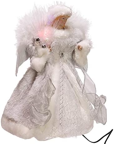 This Kurt Adler 12-Inch Silver and White Angel Tree Topper with Fiberoptic LED Lights is a beautiful, unique way to accent the lighting on your Christmas tree. Dressed in a long silver gown with burgundy accents, this angel has two large feathered wings that light up in shades of red,