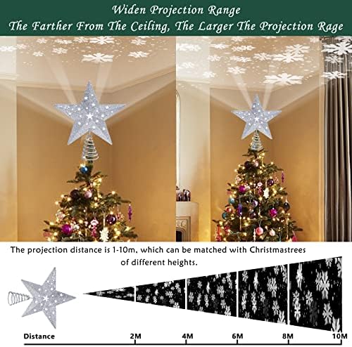 The dimensions of star tree topper is 11.3″Hx 9.6″Lx 3.94″D, The bore diameter of 1.97 inch which compatible with most artificial or live Christmas tree. It also won’t be hard for you to connect it to the socket due to the standard plug with the long wires up to 9.8ft. The Farther From The Ceiling, The Larger The Projection Rage.