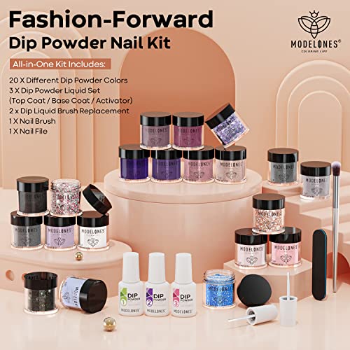 Modelones Nail Dip Powder Starter Kit 20 Colors, Dip Nail Kit with Dip Base Top Coat Activator Liquids Dip Tools, Dipping Powder Kit System for French Nail Art Beginner DIY No Lamp Needed