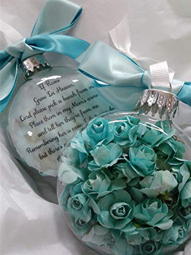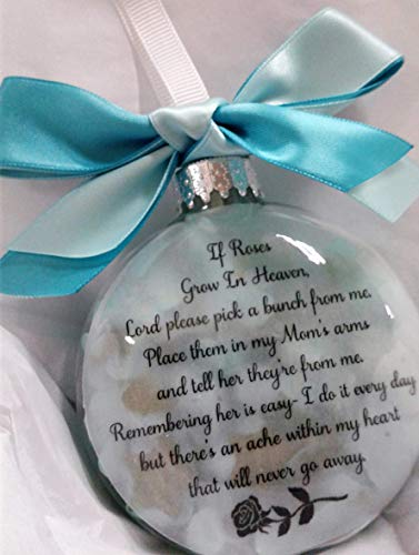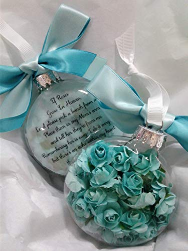 “If Roses Grow In Heaven, Lord please pick a bunch from me. Place them in my Mom’s arms and tell her they’re from me. Remembering her is easy- I do it every day but there’s an ache within my heart that will never go away.” is printed on creamy vellum and placed inside the ornament. Delicate light aqua paper roses are placed behind the vellum to show through the back of the glass and then the ornament is topped with a hand-tied with a two tone aqua and seafoam green satin bow.