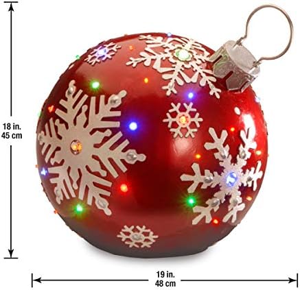 The Red Ball Ornament decor is made of fiberglass and features a motif of white snowflakes in assorted sizes with 24 UL multicolor LED lights. This decorative piece lights up the festive atmosphere of your home. A great accent piece for a yard, deck, porch, patio or wherever it is