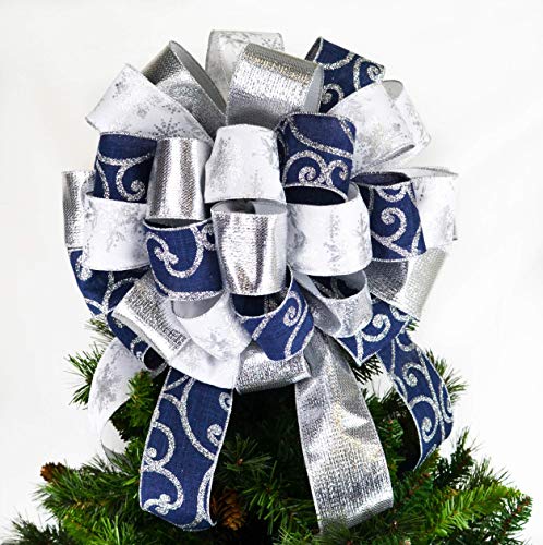 This navy blue, white and silver Christmas tree bow topper will be the perfect addition to your tree, staircase or present this Christmas season. Use it on top of your tree, as the perfect conclusion to a wonderful wrapping job, or to decorate your indoor or outdoor staircases and poles.