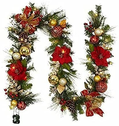Price: (as of – Details) [Classic Red Gold Theme Christmas Garland]: This realistic artificial pine garland is emblished with poinsettia flowers, red berries, ribbon bows,
