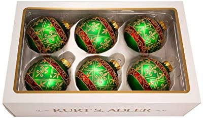 [More] Price: (as of – Details) Celebrate the season with these traditional green glass ball ornaments with red striping and gold glitter fleur-de-lis design from Kurt