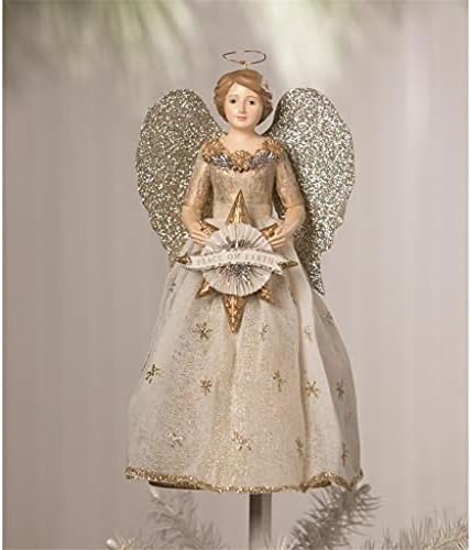 An elegant angel with fabric accents and intricate detailing, this gold and silver tree topper holds a metallic gold star in her hands with a banner that reads “Peace on Earth”, has glittered wings and delicate halo. Add a graceful, finishing touch to your tree or set this angel on