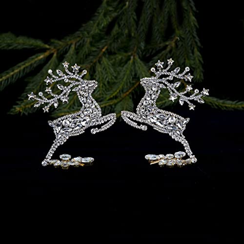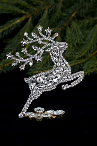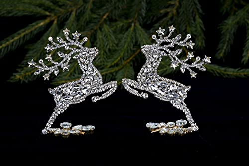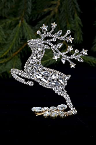 Prancing Christmas Reindeers made with clear coloured rhinestone crystals. Antlers are finished off beautifully with clear coloured star shaped rhinestone crystals. They come in a set of 2. Size: 3,9,×4,9×1,6 inch – one reindeer (10×12,5x4cm) Unique Christmas Reindeers. Hand made bijoux. Czech rhinestones. Set in non-plated brass. We follow the