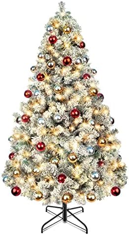 The 6 ft prelit artificial Christmas tree is decorated by fake snow flocking and warm white lights.800 branches tips to make the flocked Christmas tree more fluffy.With hinged system, it is easier to assembles, disassembles and storage.Wide metal stand to keep balance of the Christmas tree.Pre decorated Christmas tree with ornaments to make the Christmas vibe perfect.