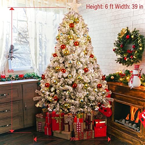 🎅【Perfect Size and Full Appearance】Crafted with 800 snow branch tips, this 6 foot flocked Christmas tree is 3.3ft wide, fluffy and full. Longer and thicker leaves make the Xmas tree looks more natural and is not easy to lumped together, they are fire resistant and non-allergenic.