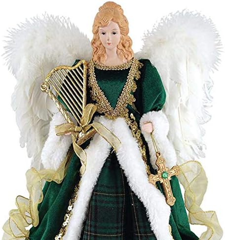 This 16″ angel tree topper is a beautiful Irish lassie. She has a green coat with white faux fur trim and her dress is green/blue plaid with gold trim. She has a gold cross in her one hand and her other hand she is holding a harp. Her wings are white feathers which compliment her perfectly.