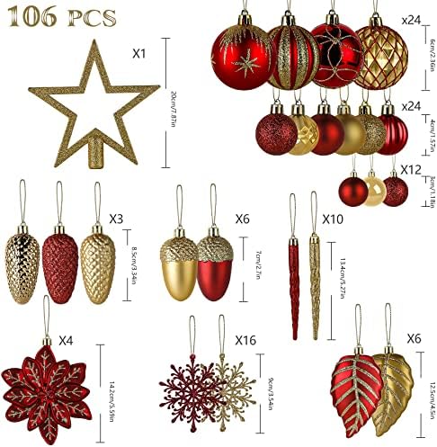 SHareconn 106pcs Christmas Balls Ornaments Set, Shatterproof Plastic Decorative Baubles for Xmas Tree Decor Holiday Wedding Party Decoration with Hooks Included, Red & Gold