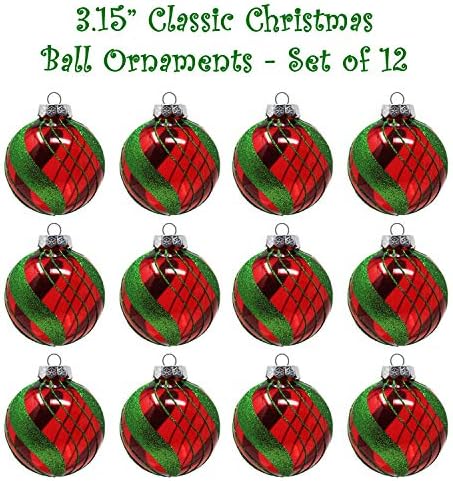 Sleetly Red Green Christmas Ornaments Rustic Vintage Shatterproof Ball Tree Decorations, 3.15″, Set of 12