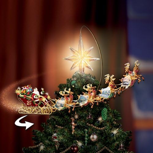 Product Description Thomas Kinkade Holidays in Motion Topper Santa is heading to your town in a sleigh filled with presents, pulled by darling reindeer. Now you can capture this image with a Thomas Kinkade Christmas tree decoration. This first-of a-kind animated Santa Claus tree topper circles around your tree on