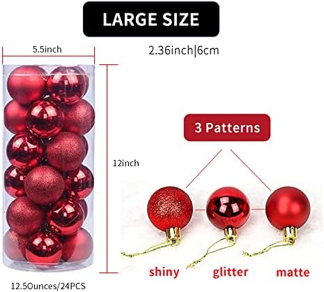 UDORANE Christmas Ball Ornaments Bulk, Large 2.36inch/6cm×24PCS, Red/ Blue/ Gold/ Silver/ Light Green, Shatterproof Plastic Ball Decorations for Xmas Tree, Party, Wedding, Holiday (Red, 2.36 in)