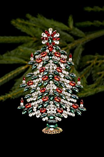 Vibrant Christmas Tree decorated with dainty clear, LT Siam and Emerald coloured rhinestone crystals cut in different shapes and sizes. Each stone is skilfully placed to make the tree vibrant and cheerful. Topped with a magnificent star and decorated with 6 flamed candles. Size : 5,91 x 8,66 x 1,77 inch (15x22x4,5cm).LChristmas Tree. Hand made bijoux. Czech rhinestones. Set in non-plated brass. We follow the spectacular craft bijoux history of our region. We use old handmade techniques and use only the finest material and best quality crystal’s. If there is an item that you are interested in but would like some changes made or something unique added, please do not hesitate to contact us. We are able to meet the demanding requirements of designs (figures up 1m high). We are able to guarantee FREE delivery to USA within max. 10 working days via FEDEX. Free worldwide economical transport for the rest of world may take up 2 to 30 days.