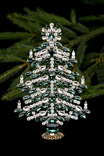 Vibrant Christmas Tree decorated with dainty clear and Emerald coloured rhinestone crystals cut in different shapes and sizes. Each stone is skilfully placed to make the tree vibrant and cheerful. Topped with a magnificent star and decorated with 6 flamed candles. Size : 5,91 x 8,66 x 1,77 inch (15x22x4,5cm). Christmas Tree. Hand made bijoux. Czech rhinestones. Set in non-plated brass. We follow the spectacular craft bijoux history of our region. We use old handmade techniques and use only the finest material and best quality crystal’s. If there is an item that you are interested in but would like some changes made or something unique added, please do not hesitate to contact us. We are able to meet the demanding requirements of designs (figures up 1m high). We are able to guarantee FREE delivery to USA within max. 10 working days via FEDEX. Free worldwide economical transport for the rest of world may take up 2 to 30 days.