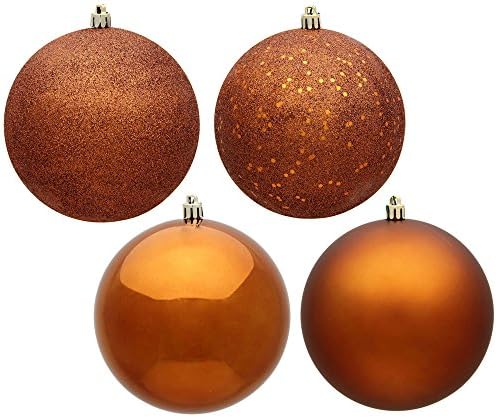 Vickerman 12 in. Copper 4-Finish Ball Christmas Ornament, 4 per Bag Made of Shatterproof PlasticAssorted Shiny, Matte, Glitter, and Sequin FinishesDrilled and Wired Secure Cap4 Ornaments per pack