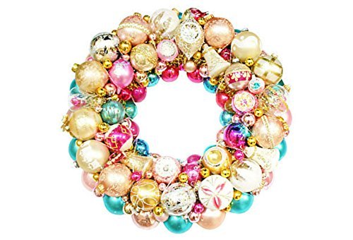 Vintage ornament wreath designed using vintage ornaments in pink and aqua from Bavaria, Russia, Japan, Poland, and USA. Gently wire wrapped with german spun tinsel. One of a kind The ornaments may show small scratches, wear marks, fading and oxidation which only adds to their nostaligic charm and is intentional in the design of this wreath. Measures 20 inches.