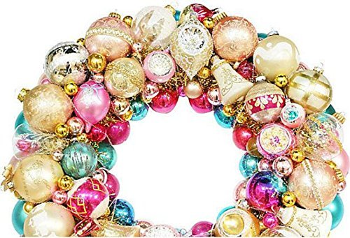 Vintage ornament wreath designed using vintage ornaments in pink and aqua from Bavaria, Russia, Japan, Poland, and USA. Gently wire wrapped with german spun tinsel. One of a kind The ornaments may show small scratches, wear marks, fading and oxidation which only adds to their nostaligic charm and is intentional