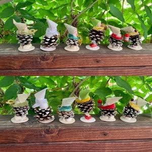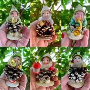 Vintage Pinecone Elf Elves Pixie Gnomes Christmas Ornaments 1940 1950 Retro Kitsch MCM Set 6 IOB Absolutely adorable set of vintage pinecone ornaments. The pinecones are natural and all of the elf Pixies or Gnomes have flocked cone hats and are holding or carrying various items. They measure approximately 3“